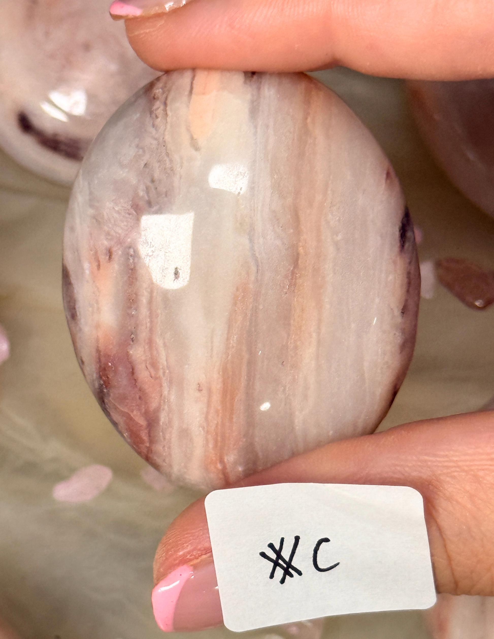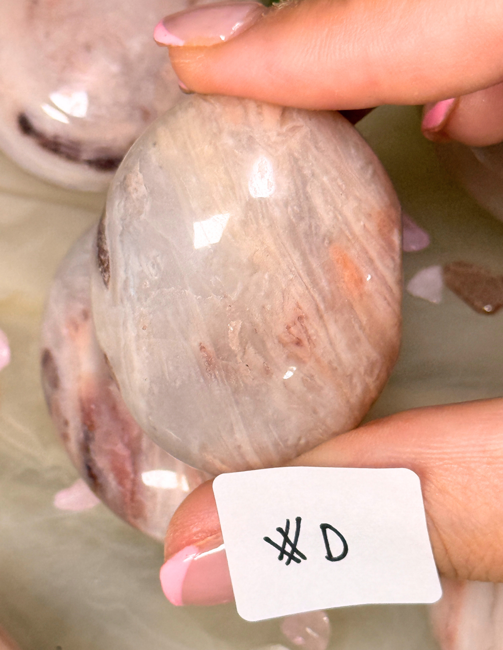 Each piece features delicate blush and rose tones with natural patterning throughout polished stone. Some show subtle marbling, others soft inclusions and variation, making every palm stone completely one of a kind.